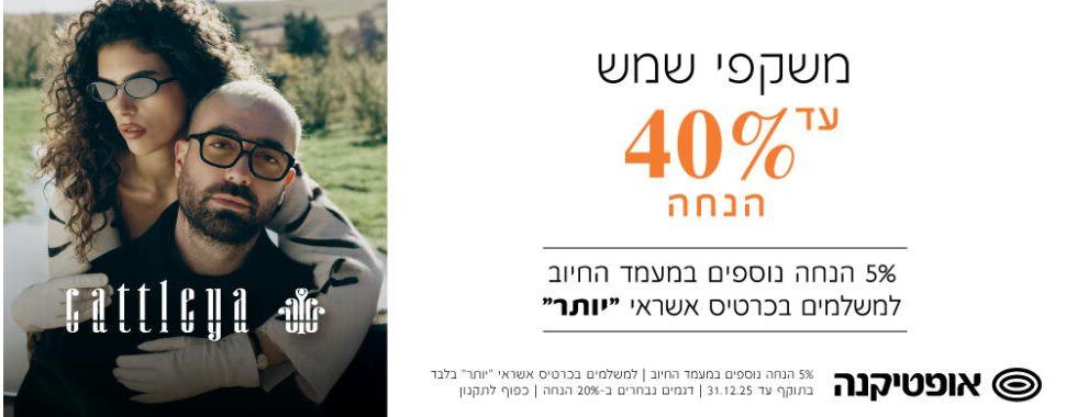 הערות משפטיות: *ההנחה במעמד החיוב למשלמים בכרטיס אשראי יותר *דגמים נבחרים ב-20% הנחה *בתוקף עד 31/12/25 *כפוף לתקנון אופטיקנה *טל"ח